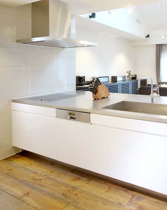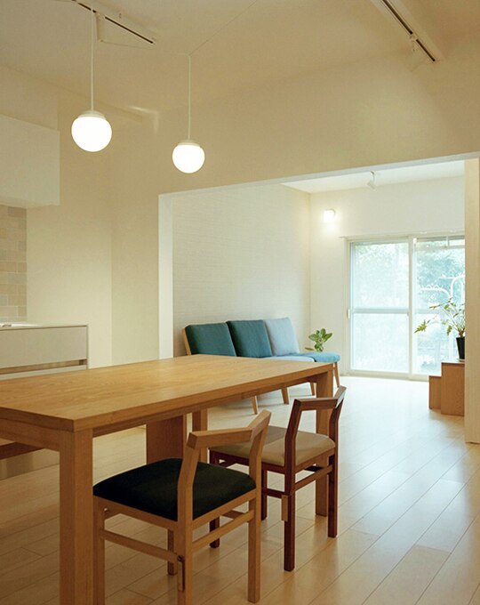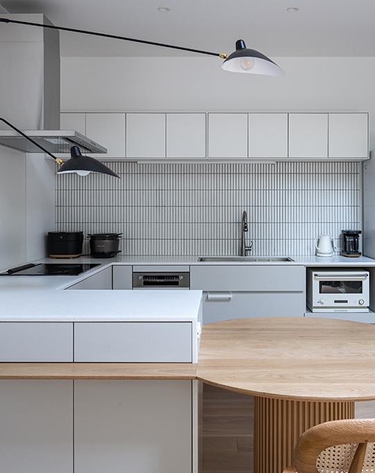 以工業風吊燈與石英岩檯面打造現代感開放廚房。